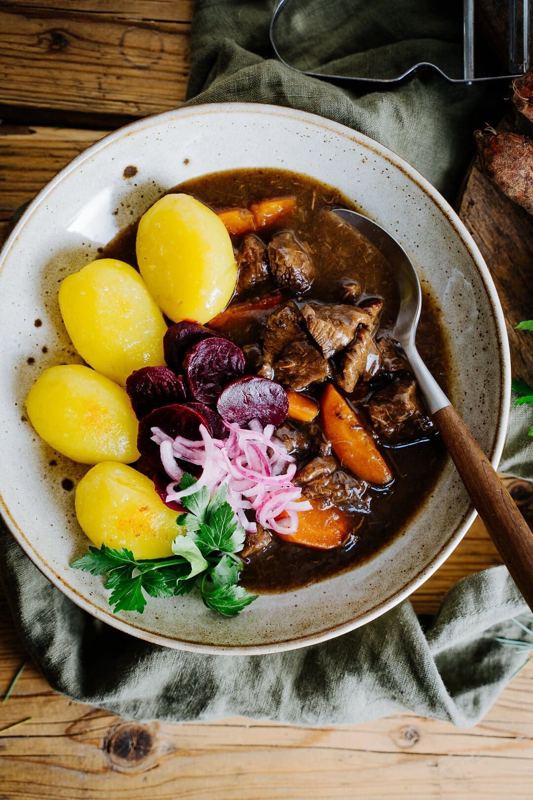 Mit Butterkartoffeln und eingelegter roter Bete servieren.